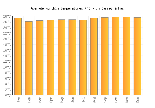 The bar chart below shows the average monthly peak daytime temperatures at Barreirinhas