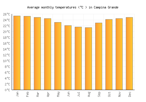 The bar chart below shows the average monthly peak daytime temperatures at Campina Grande