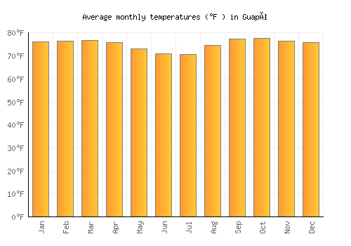 | Max °F | 76.1 | 76.5 | 76.8 | 75.9 | 73.2 | 70.9 | 70.7 | 74.5 | 77.4 | 77.7 | 76.6 | 75.9 |