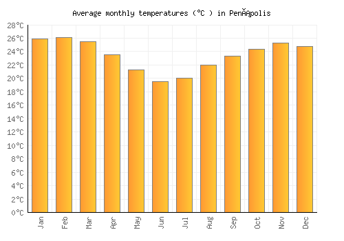 The bar chart below shows the average monthly peak daytime temperatures at Penápolis