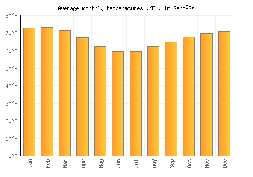 The bar chart below shows the average monthly peak daytime temperatures at Sengés