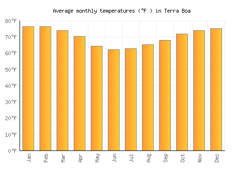The bar chart below shows the average monthly peak daytime temperatures at Terra Boa