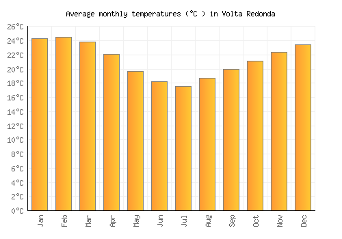 The bar chart below shows the average monthly peak daytime temperatures at Volta Redonda