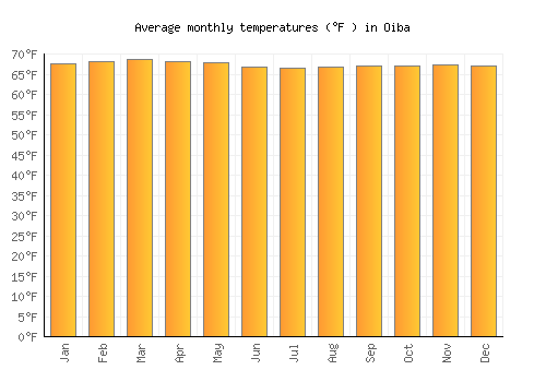 The bar chart below shows the average monthly peak daytime temperatures at Oiba