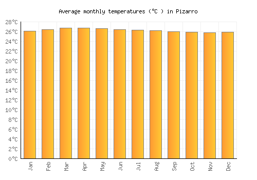 The bar chart below shows the average monthly peak daytime temperatures at Pizarro