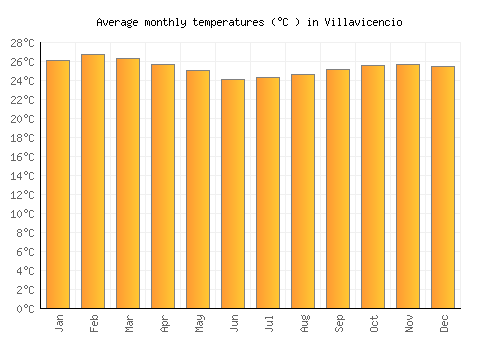 The bar chart below shows the average monthly peak daytime temperatures at Villavicencio