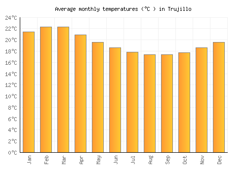 The bar chart below shows the average monthly peak daytime temperatures at Trujillo