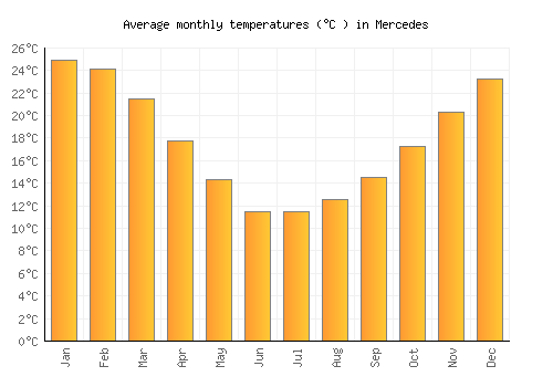 The bar chart below shows the average monthly peak daytime temperatures at Mercedes